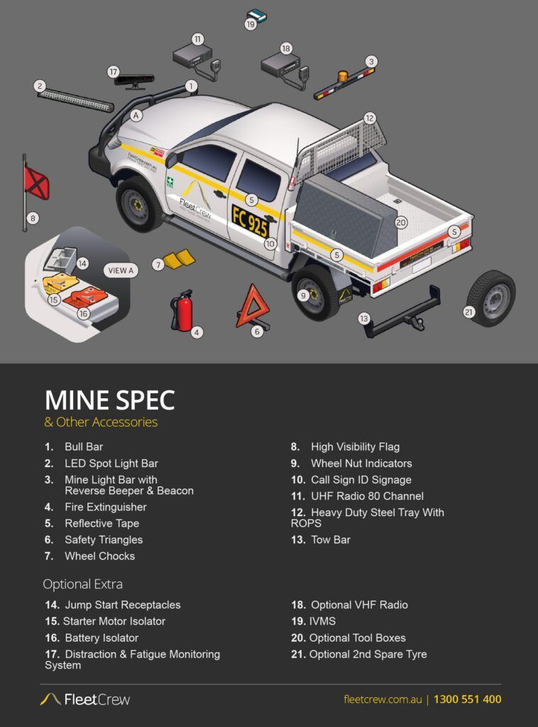 FleetCrew has a wide range of Mine Spec Vehicles for short or long term hire. Our mine spec hire vehicles are fully compliant, fitted out to the highest standards, & delivered on time.