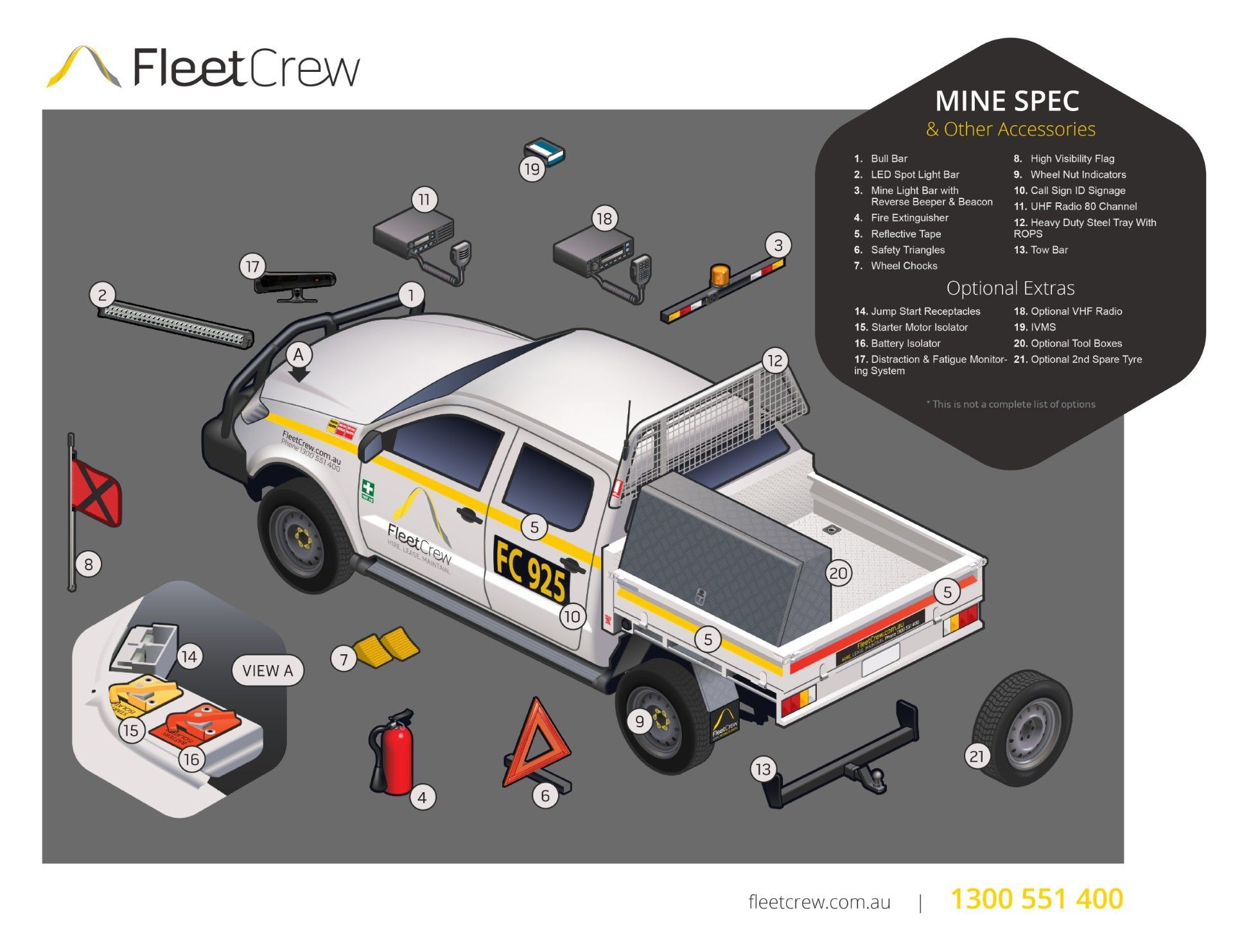 We will work with you to ensure the vehicles you hire are picked up with the correct specifications you need to get on-site. Please let us know where your 4WD vehicle is heading, so we can make sure it is equipped as needed prior to collection. Please read Understanding custom mine specifications to learn more about how FleetCrew customises our vehicles to meet mine specifications. Check our complete fleet of mine spec vehicles available.